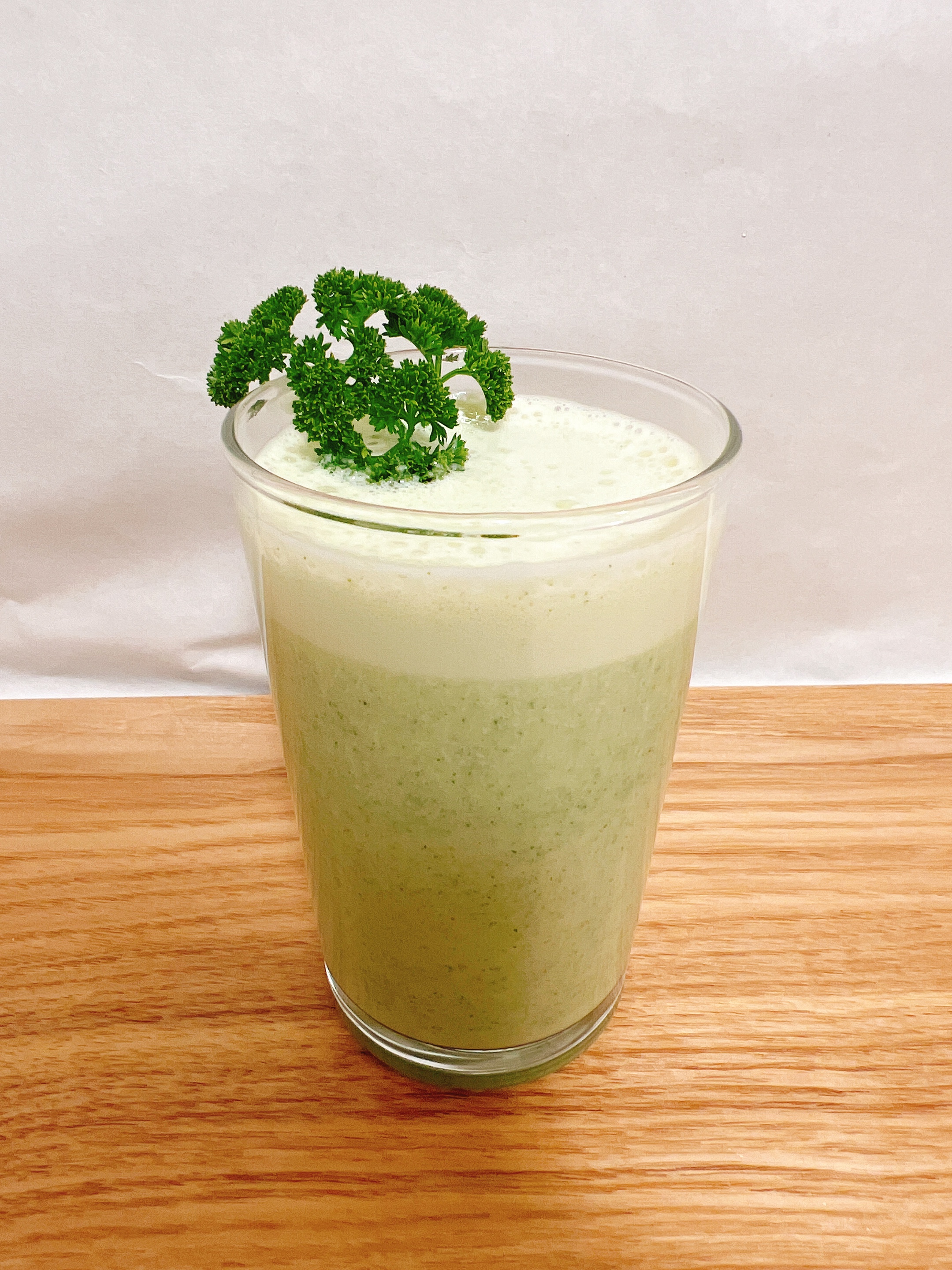材料(5杯分) 祇園パセリ 50g 豆乳 550ml (うち350mlは冷凍) 冷凍バナナ 1/2本 はちみつ お好みで(大さじ2程度) レシピ提供:祇園町農事研究会 パセリ部会 |