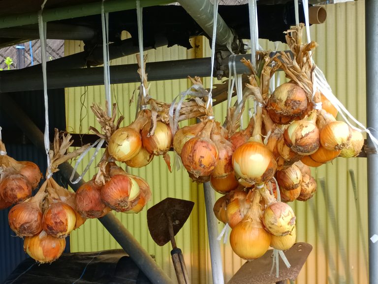農園内で収穫したタマネギを使ってドレッシング作りを行います。 |